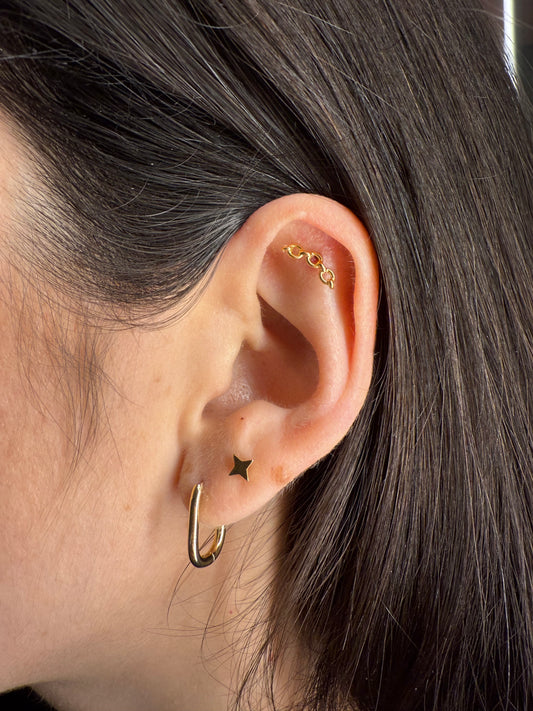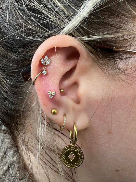 Situé à l'entrée de l'oreille, il faut compter environ 3 mois de cicatrisation. Il peut être accessoirisé avec une Barre ou un Anneau de 6 mm à 8 mm.