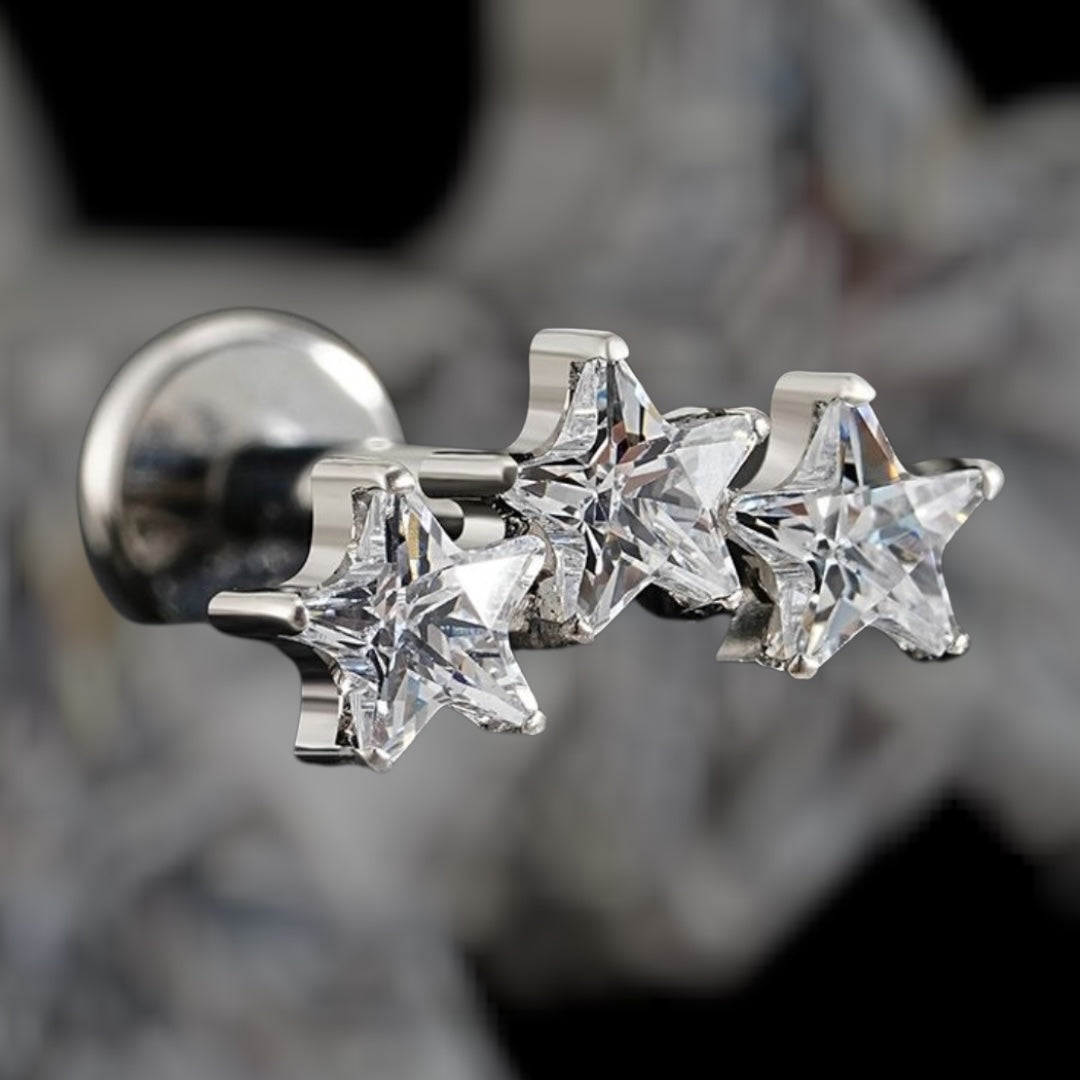 Description du Bijoux PiercingBijoux piercing en Titane de type Labret en forme de trio d'étoile en strass pour un look rock. Disponible en Gold et Silver, ce bijoux piercing Labret ajoutera une touche originale à votre look. Sa forme de petites étoiles offre une touche originale à votre look. Ce bijoux piercing de type labret sublimera votre oreille avec distinction.